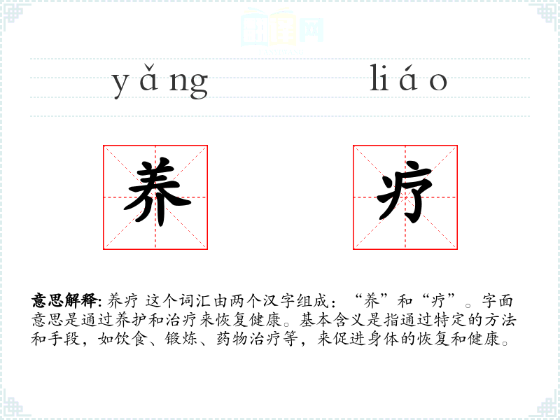 养疗 这个词汇由两个汉字组成:“养”和“疗”。字面意思是通过养护和治疗来恢复健康。基本含义是指通过特定的方法和手段,如饮食、锻炼、药物治疗等,来促进身体的恢复和健康。