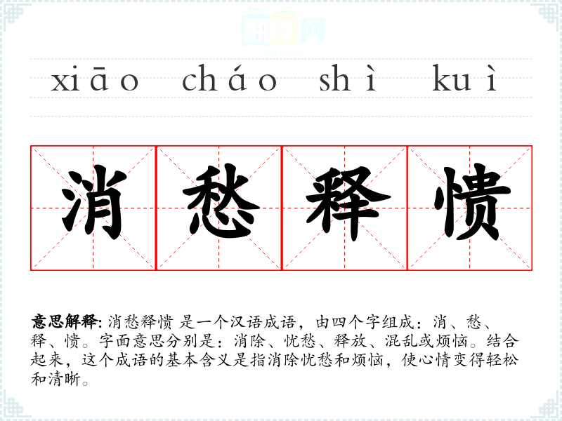 消愁释愦 是一个汉语成语,由四个字组成:消、愁、释、愦。字面意思分别是:消除、忧愁、释放、混乱或烦恼。结合起来,这个成语的基本含义是指消除忧愁和烦恼,使心情变得轻松和清晰。
