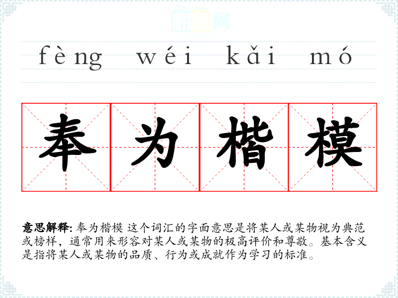 奉为楷模 这个词汇源于汉语,其中“奉”意为尊敬、推崇,“楷模”原指书法中的标准字体,后引申为行为或品质的标准。这个词汇在古代文献中已有使用,如《左传》中有“楷模”一词的记载,现代汉语中继续沿用并扩展了其含义。