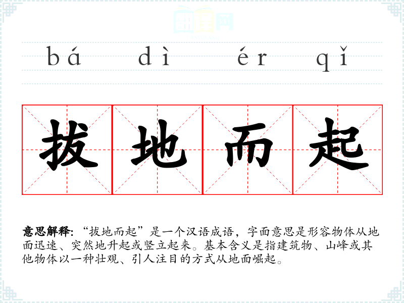 “拔地而起”这个成语不仅描述了物理上的崛起,也象征着社会和个人层面的快速发展和成功。在语言学*和表达中,它是一个富有表现力和启发性的词汇。