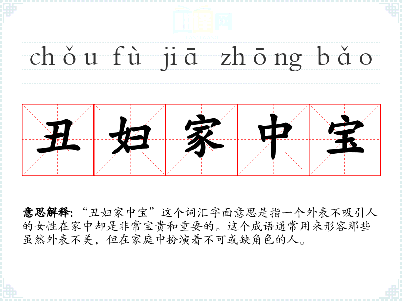 “丑妇家中宝”这个词汇字面意思是指一个外表不吸引人的女性在家中却是非常宝贵和重要的。这个成语通常用来形容那些虽然外表不美,但在家庭中扮演着不可或缺角色的人。