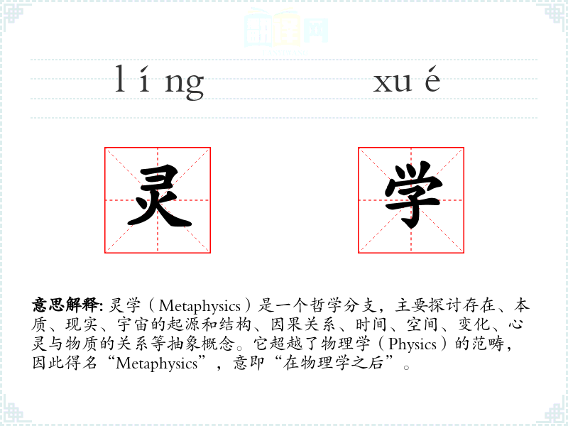 灵学(Metaphysics)是一个哲学分支,主要探讨存在、本质、现实、宇宙的起源和结构、因果关系、时间、空间、变化、心灵与物质的关系等抽象概念。它超越了物理学(Physics)的范畴,因此得名“Metaphysics”,意即“在物理学之后”。