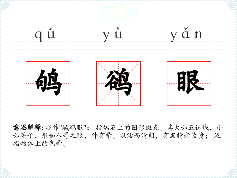 亦作"鹹鹆眼"; 指端石上的圆形斑点。其大如五铢钱,小如芥子,形如八哥之眼,外有晕。以活而清朗,有黑精者为贵; 泛指物体上的色晕。