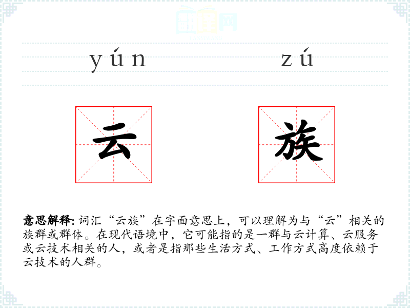 “云族”一词可能是随着云计算技术的发展而新兴的词汇。它结合了“云”这一现代科技概念和“族”这一表示群体的后缀,形成了一个具有时代特色的新词。