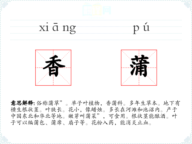 1.俗称蒲草”。单子叶植物,香蒲科。多年生草本。地下有横生根状茎。叶狭长。花小,像蜡烛。多长在河滩和池沼内。产于中国东北和华北等地。嫩芽叫蒲菜”,可食用。根状茎能酿酒。叶子可以编蒲包、蒲席、扇子等。花粉入药,能消炎止血。