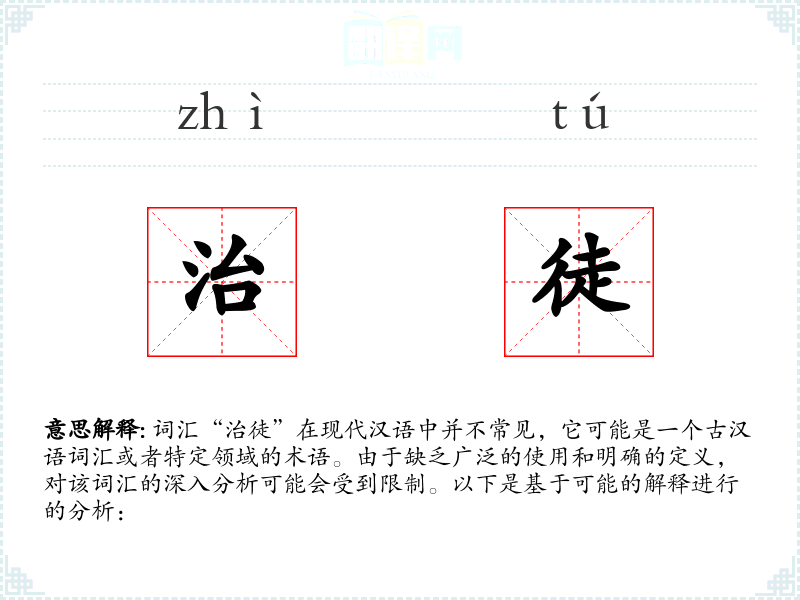 词汇“治徒”在现代汉语中并不常见,它可能是一个古汉语词汇或者特定领域的术语。由于缺乏广泛的使用和明确的定义,对该词汇的深入分析可能会受到限制。以下是基于可能的解释进行的分析:
