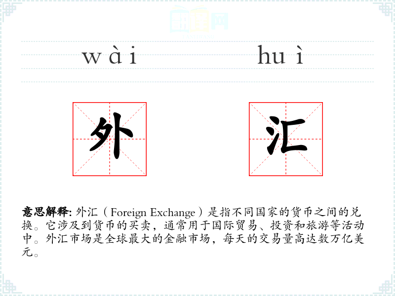 外汇(Foreign Exchange)是指不同国家的货币之间的兑换。它涉及到货币的买卖,通常用于国际贸易、投资和旅游等活动中。外汇市场是全球最大的金融市场,每天的交易量高达数万亿美元。