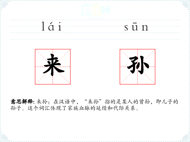 “来孙”一词源于汉语,由“来”和“孙”组成,字面意思是从远处来的孙子。在古代汉语中,这个词汇就已经存在,用以描述家族中的特定辈分。