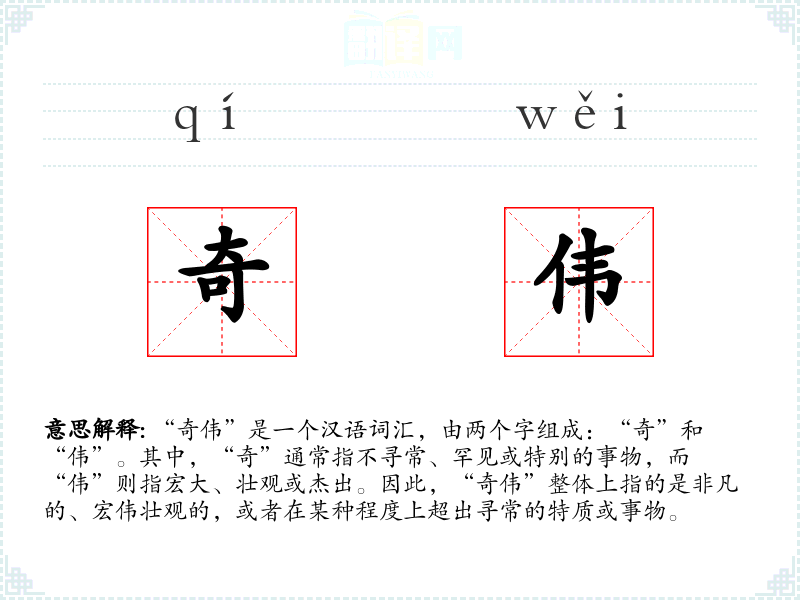 “奇伟”是一个汉语词汇,由两个字组成:“奇”和“伟”。其中,“奇”通常指不寻常、罕见或特别的事物,而“伟”则指宏大、壮观或杰出。因此,“奇伟”整体上指的是非凡的、宏伟壮观的,或者在某种程度上超出寻常的特质或事物。