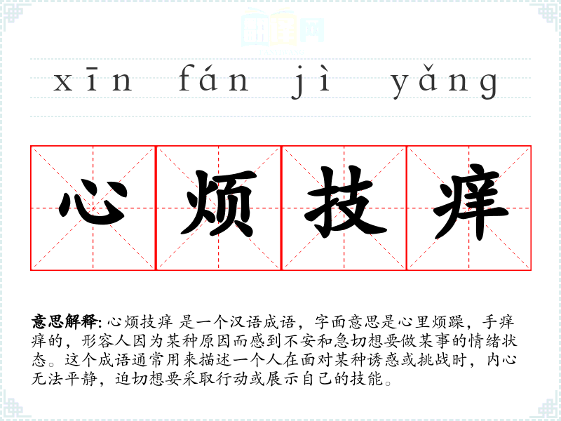 心烦技痒 是一个汉语成语,字面意思是心里烦躁,手痒痒的,形容人因为某种原因而感到不安和急切想要做某事的情绪状态。这个成语通常用来描述一个人在面对某种诱惑或挑战时,内心无法平静,迫切想要采取行动或展示自己的技能。