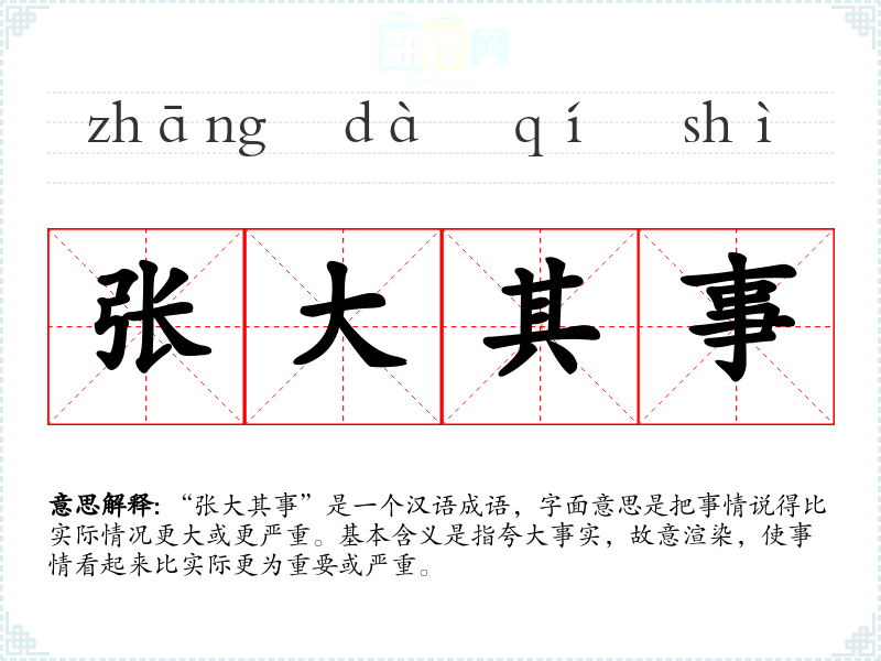 “张大其事”是一个汉语成语,字面意思是把事情说得比实际情况更大或更严重。基本含义是指夸大事实,故意渲染,使事情看起来比实际更为重要或严重。