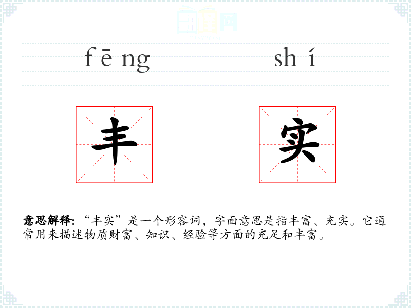 “丰实”由“丰”和“实”两个字组成。“丰”字古已有之,意为丰富、丰满;“实”字意为充实、实在。两者结合,形成了“丰实”这一词汇,用以形容事物的丰富和充实状态。