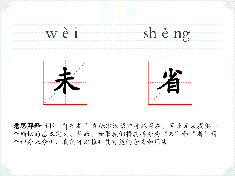 词汇“[未省]”在标准汉语中并不存在,因此无法提供一个确切的基本定义。然而,如果我们将其拆分为“未”和“省”两个部分来分析,我们可以推测其可能的含义和用法。