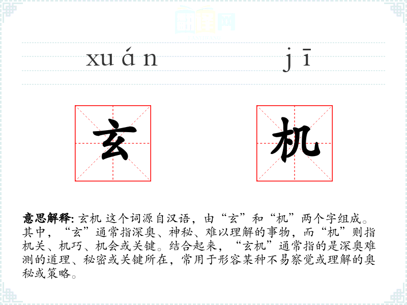玄机 这个词源自汉语,由“玄”和“机”两个字组成。其中,“玄”通常指深奥、神秘、难以理解的事物,而“机”则指机关、机巧、机会或关键。结合起来,“玄机”通常指的是深奥难测的道理、秘密或关键所在,常用于形容某种不易察觉或理解的奥秘或策略。