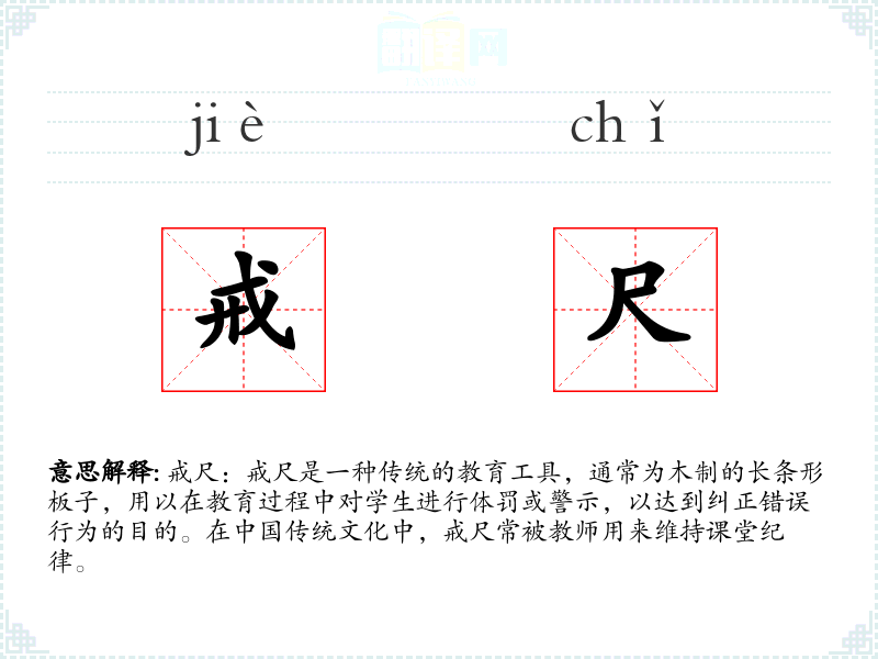 戒尺:戒尺是一种传统的教育工具,通常为木制的长条形板子,用以在教育过程中对学生进行体罚或警示,以达到纠正错误行为的目的。在**传统文化中,戒尺常被教师用来维持课堂纪律。