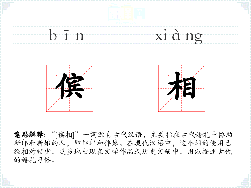 “[傧相]”一词源自古代汉语,主要指在古代婚礼中协助新郎和新娘的人,即伴郎和伴娘。在现代汉语中,这个词的使用已经相对较少,更多地出现在文学作品或历史文献中,用以描述古代的婚礼*俗。