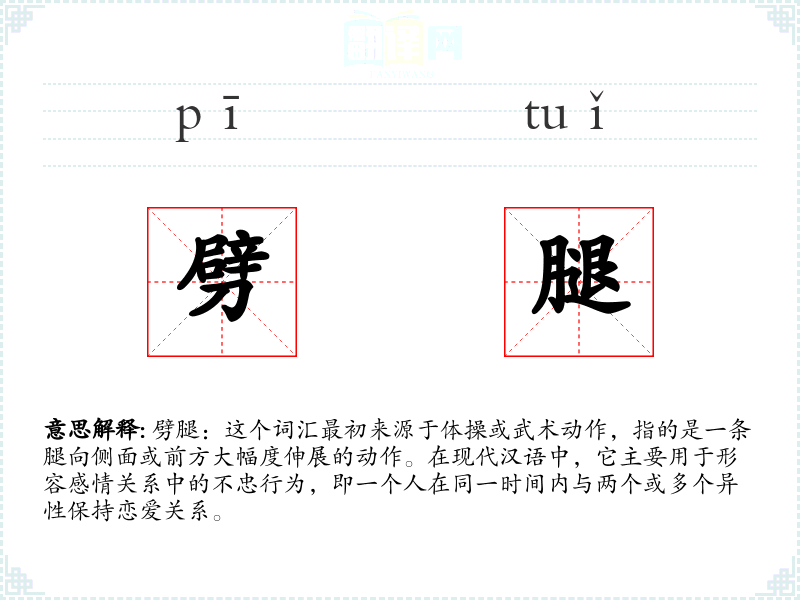 劈腿:这个词汇最初来源于体操或武术动作,指的是一条腿向侧面或前方大幅度伸展的动作。在现代汉语中,它主要用于形容感情关系中的不忠行为,即一个人在同一时间内与两个或多个异性保持恋爱关系。