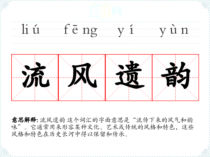 流风遗韵 这个词汇的字面意思是“流传下来的风气和韵味”。它通常用来形容某种文化、艺术或传统的风格和特色,这些风格和特色在历史长河中得以保留和传承。
