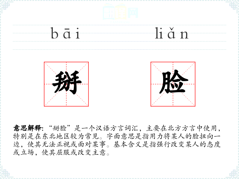 “掰脸”是一个汉语方言词汇,主要在北方方言中使用,特别是在东北地区较为常见。字面意思是指用力将某人的脸扭向一边,使其无法正视或面对某事。基本含义是指强行改变某人的态度或立场,使其屈服或改变主意。
