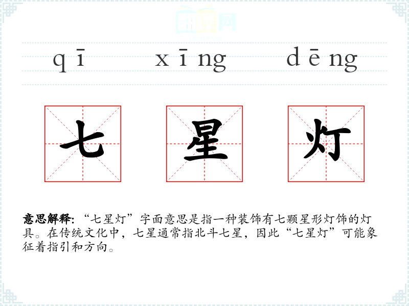 “七星灯”字面意思是指一种装饰有七颗星形灯饰的灯具。在传统文化中,七星通常指北斗七星,因此“七星灯”可能象征着指引和方向。