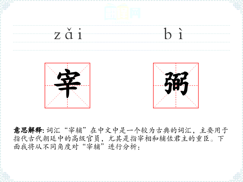 词汇“宰辅”在中文中是一个较为古典的词汇,主要用于指代古代朝廷中的高级官员,尤其是指宰相和辅佐君主的重臣。下面我将从不同角度对“宰辅”进行分析: