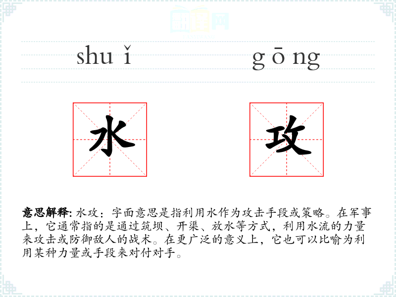 - 反义词:火攻、土攻(这些词汇在军事战术中对应不同的攻击手段)