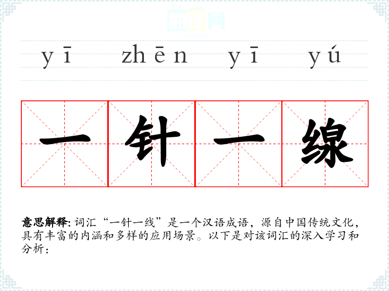 词汇“一针一线”是一个汉语成语,源自*传统文化,具有丰富的内涵和多样的应用场景。以下是对该词汇的深入学和分析: