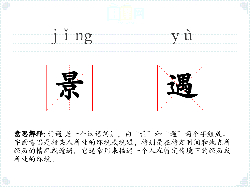 “景遇”一词的词源较为传统,源自古代汉语,其中“景”指景象或环境,“遇”指遭遇或经历。在古代文学中已有使用,现代汉语中保留了其基本含义,但在使用频率上可能不如一些更现代的词汇。