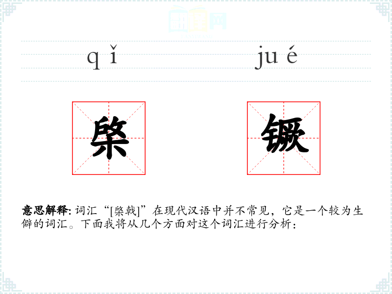 词汇“[棨戟]”在现代汉语中并不常见,它是一个较为生僻的词汇。下面我将从几个方面对这个词汇进行分析: