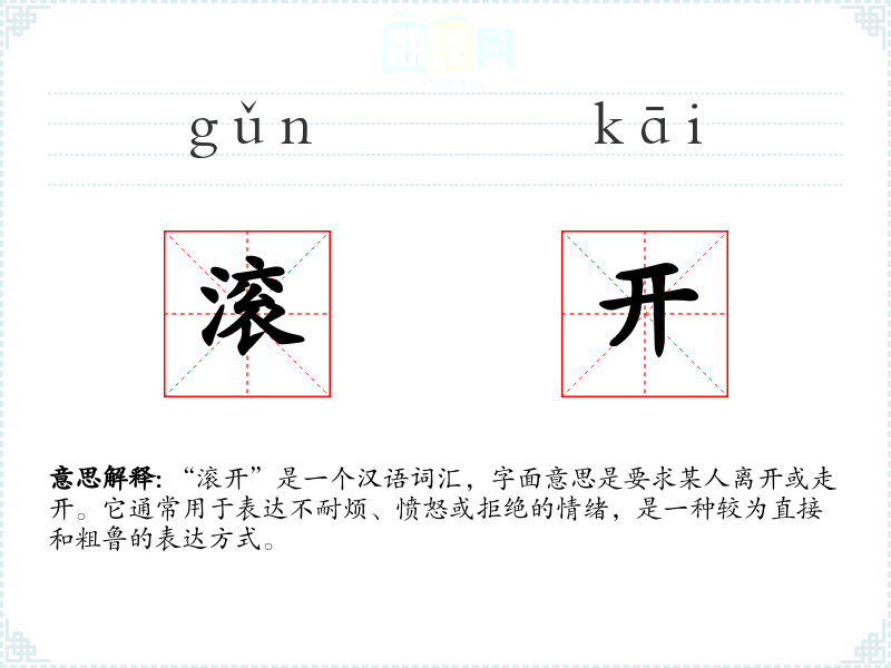 “滚开”是一个汉语词汇,字面意思是要求某人离开或走开。它通常用于表达不耐烦、愤怒或拒绝的情绪,是一种较为直接和粗鲁的表达方式。