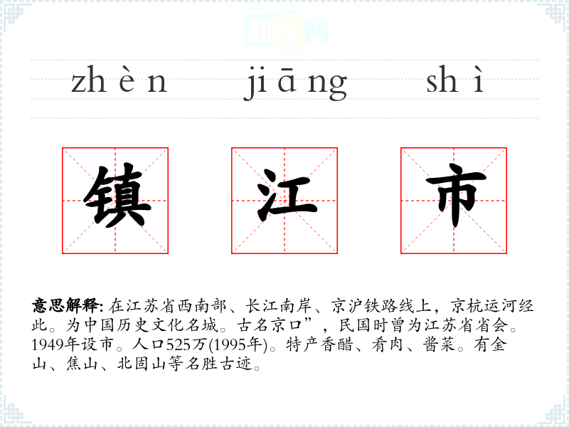1.在江苏省西南部、长江南岸、京沪铁路线上,京杭运河经此。为中国历史文化名城。古名京口”,民国时曾为江苏省省会。1949年设市。人口525万(1995年)。特产香醋、肴肉、酱菜。有金山、焦山、北固山等名胜古迹。