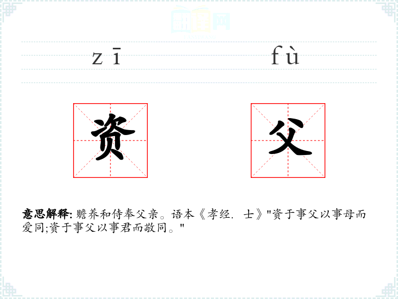 赡养和侍奉父亲。语本《孝经.士》"资于事父以事母而爱同;资于事父以事君而敬同。"