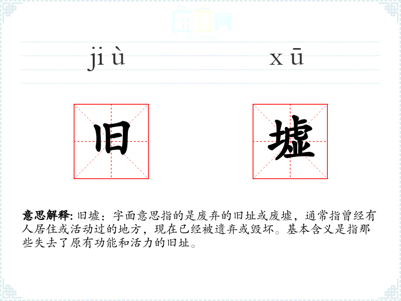 旧墟:字面意思指的是废弃的旧址或废墟,通常指曾经有人居住或活动过的地方,现在已经被遗弃或毁坏。基本含义是指那些失去了原有功能和活力的旧址。