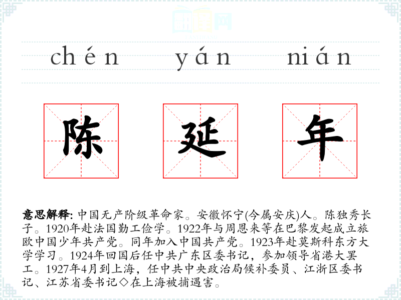 1.中国无产阶级革命家。安徽怀宁(今属安庆)人。陈独秀长子。1920年赴法国勤工俭学。1922年与周恩来等在巴黎发起成立旅欧中国少年共产党。同年加入中国共产党。1923年赴莫斯科东方大学学习。1924年回国后任中共广东区委书记,参加领导省港大罢工。1927年4月到上海,任中共中央政治局候补委员、江浙区委书记、江苏省委书记◇在上海被捕遇害。