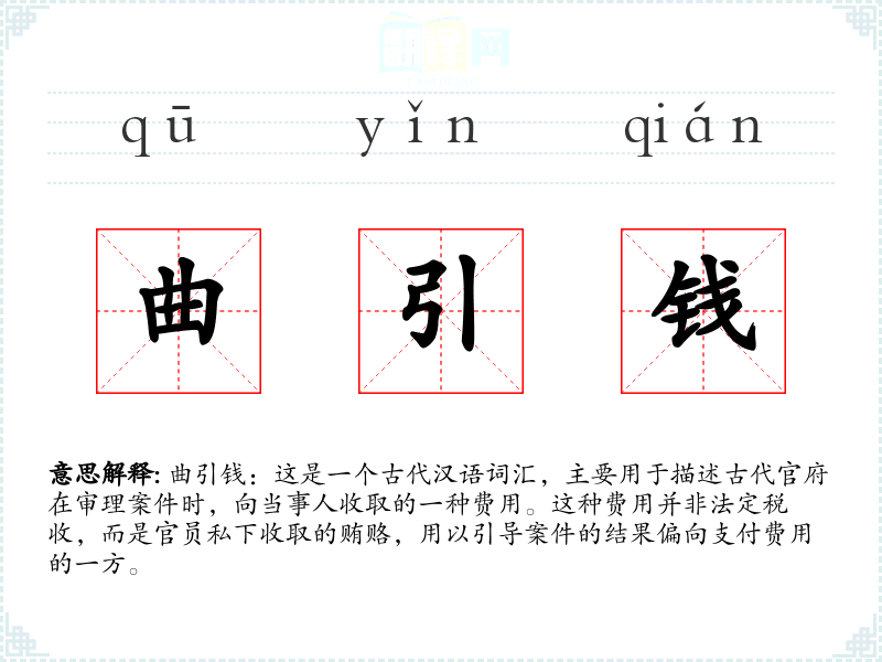 曲引钱:这是一个古代汉语词汇,主要用于描述古代官府在审理案件时,向当事人收取的一种费用。这种费用并非法定税收,而是官员私下收取的贿赂,用以引导案件的结果偏向支付费用的一方。