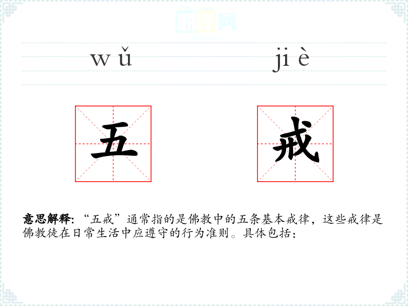 - 同义词:五戒的同义词可能包括“五条戒律”、“五项基本戒律”等,这些词汇在表达上更为正式和学术。