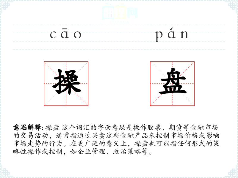 操盘 这个词汇的字面意思是操作股票、期货等金融市场的交易活动,通常指通过买卖这些金融产品来控制市场价格或影响市场走势的行为。在更广泛的意义上,操盘也可以指任何形式的策略性操作或控制,如企业管理、政治策略等。