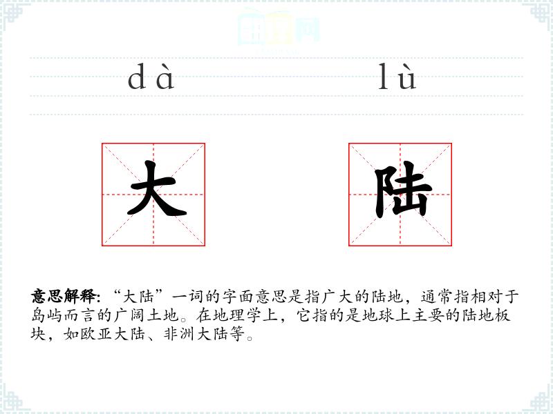 “大陆”一词的字面意思是指广大的陆地,通常指相对于岛屿而言的广阔土地。在地理学上,它指的是地球上主要的陆地板块,如欧亚大陆、非洲大陆等。