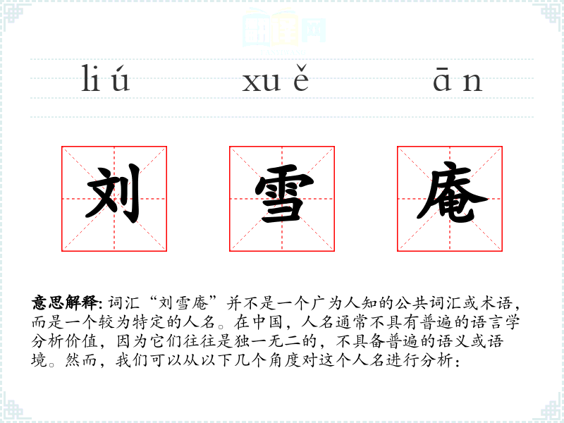 词汇“刘雪庵”并不是一个广为人知的公共词汇或术语,而是一个较为特定的人名。在**,人名通常不具有普遍的语言学分析价值,因为它们往往是独一无二的,不具备普遍的语义或语境。然而,我们可以从以下几个角度对这个人名进行分析: