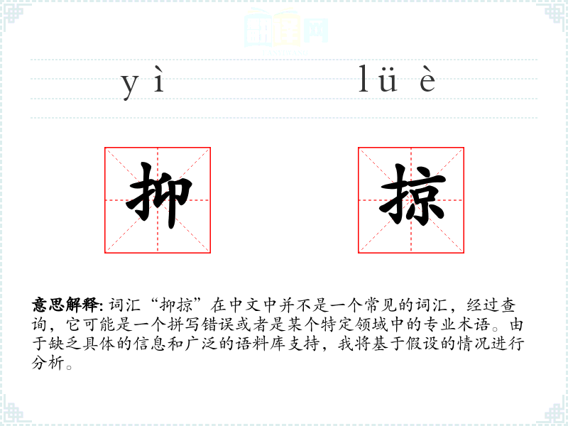 词汇“抑掠”在中文中并不是一个常见的词汇,经过查询,它可能是一个拼写错误或者是某个特定领域中的专业术语。由于缺乏具体的信息和广泛的语料库支持,我将基于假设的情况进行分析。