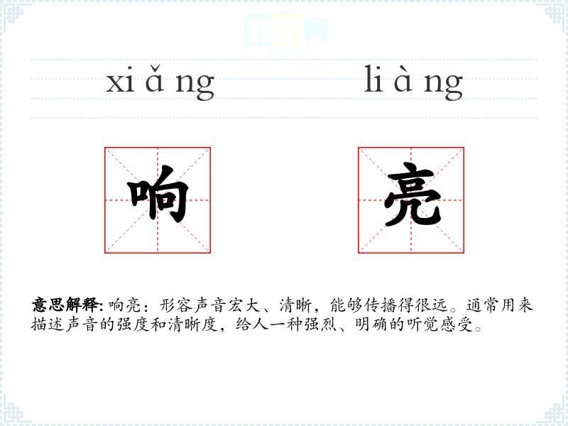 “响亮”一词由“响”和“亮”两个字组成。“响”字古已有之,表示声音的传播;“亮”字则表示明亮、清晰。两者结合,形成了形容声音宏大、清晰的词汇。
