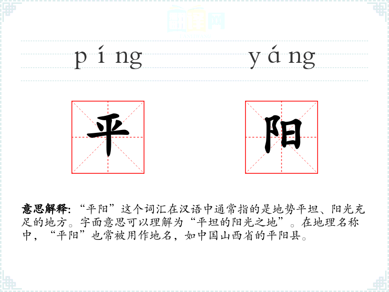 “平阳”这个词汇在汉语中通常指的是地势平坦、阳光充足的地方。字面意思可以理解为“平坦的阳光之地”。在地理名称中,“平阳”也常被用作地名,如**山西省的平阳县。