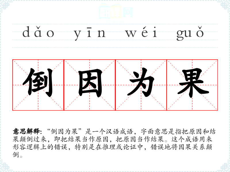 “倒因为果”是一个汉语成语,字面意思是指把原因和结果颠倒过来,即把结果当作原因,把原因当作结果。这个成语用来形容逻辑上的错误,特别是在推理或论证中,错误地将因果关系颠倒。