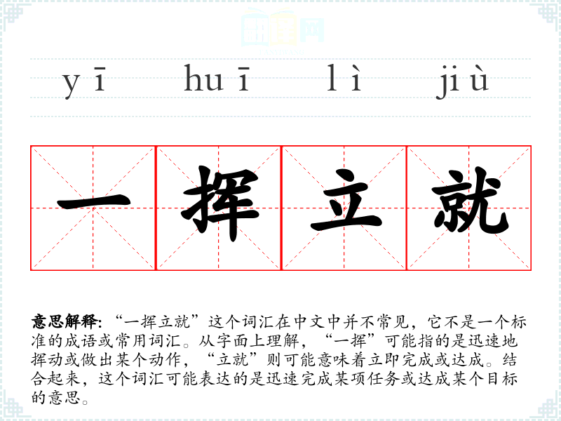 “一挥立就”这个词汇虽然不常见,但它能够形象地表达迅速完成任务的概念。在语言学习和表达中,了解和掌握这样的词汇可以丰富我们的表达方式,使我们的语言更加生动和有力。