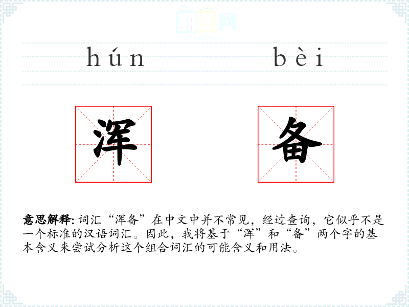 词汇“浑备”在中文中并不常见,经过查询,它似乎不是一个标准的汉语词汇。因此,我将基于“浑”和“备”两个字的基本含义来尝试分析这个组合词汇的可能含义和用法。