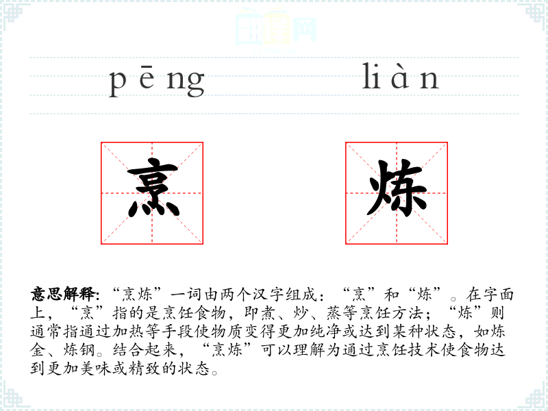 “烹炼”一词由两个汉字组成:“烹”和“炼”。在字面上,“烹”指的是烹饪食物,即煮、炒、蒸等烹饪方法;“炼”则通常指通过加热等手段使物质变得更加纯净或达到某种状态,如炼金、炼钢。结合起来,“烹炼”可以理解为通过烹饪技术使食物达到更加美味或精致的状态。