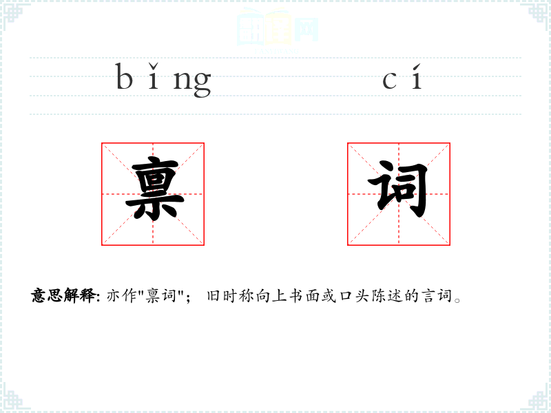 亦作"禀词"; 旧时称向上书面或口头陈述的言词。