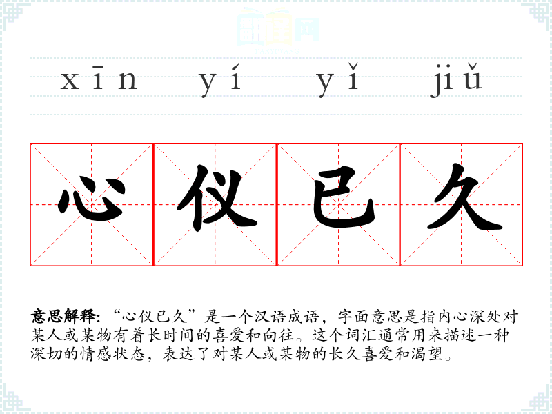 “心仪已久”是一个汉语成语,字面意思是指内心深处对某人或某物有着长时间的喜爱和向往。这个词汇通常用来描述一种深切的情感状态,表达了对某人或某物的长久喜爱和渴望。