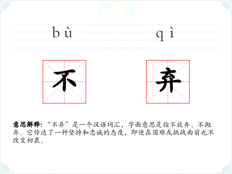 “不弃”由“不”和“弃”两个字组成。在古代汉语中,“弃”原本指抛弃、放弃,而“不”则是一个否定词。随着时间的推移,“不弃”逐渐被用来表达一种积极的、坚持的态度。