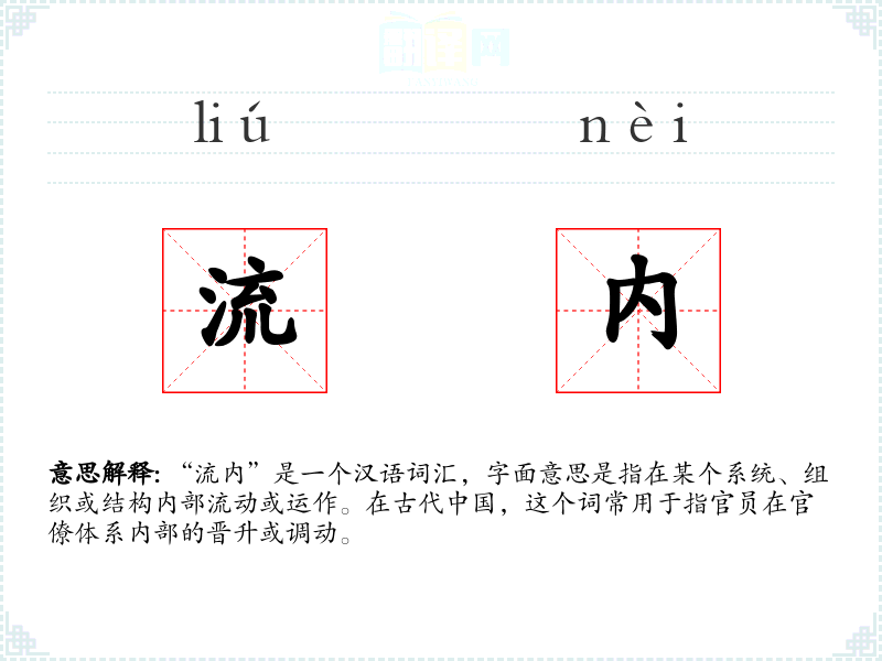 “流内”是一个汉语词汇,字面意思是指在某个系统、组织或结构内部流动或运作。在古代**,这个词常用于指官员在官僚体系内部的晋升或调动。